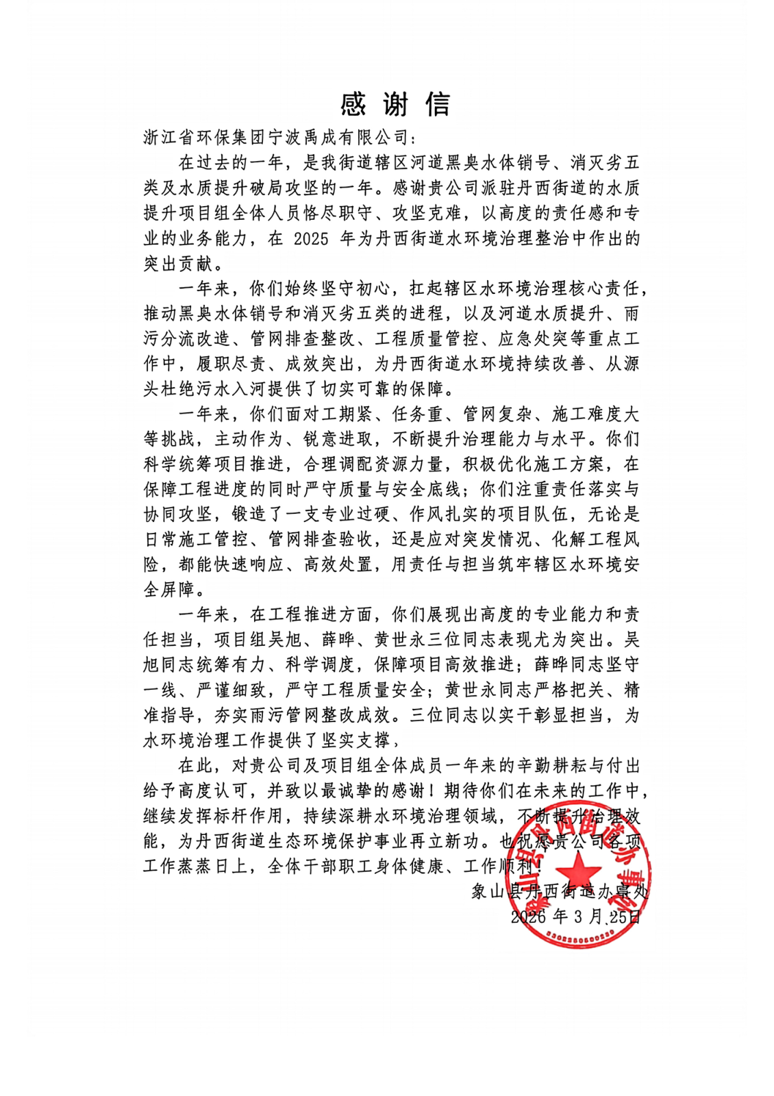 3月25日,象山县丹西街道办事处向紫光环保下属宁波禹成公司送来一封情真意切的感谢信,字里行间满是对其派驻项目组一年来辛勤付出的肯定与感激。
