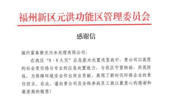 近日,福州元洪投资区“8·8”火灾事故应急废水处置工作圆满收官,紫光环保下属子公司福州紫光作为园区环境安全的重要保障力量,在此次突发应急事件中,成功筑起水环境安全防线,收到了元洪投资区的书面感谢信,并获得其高度赞扬。
